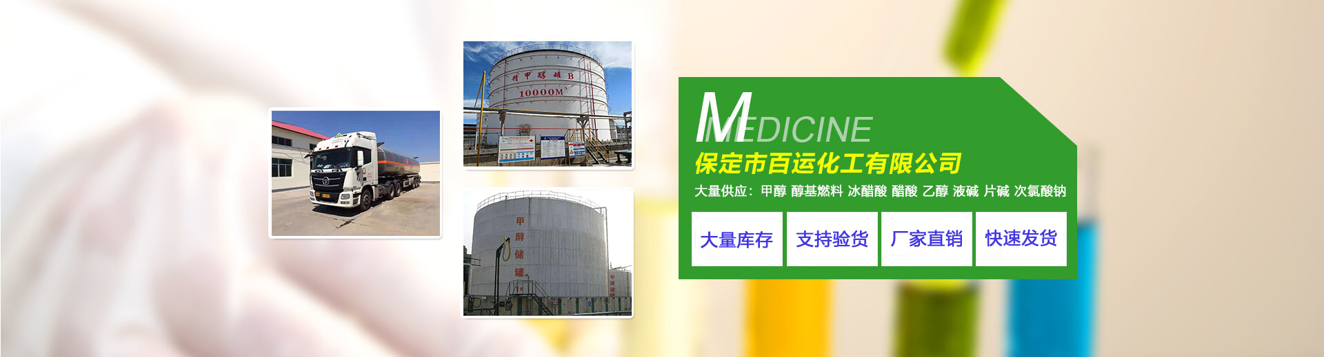 保定市百運化工有限公司注冊于1998年9月,隸屬海南百運醫(yī)藥集團(tuán)子公司,大慶石化華北網(wǎng)點,京津冀中心城市保定市,主要經(jīng)營:甲醇、乙醇、醋酸(乙酸)、醋酸鈉(乙酸鈉)、復(fù)合碳源、醇基燃料、鍋爐油、污水處理藥劑、次氯酸鈉、漂液、液堿、氫氧化鈉等化工產(chǎn)品。